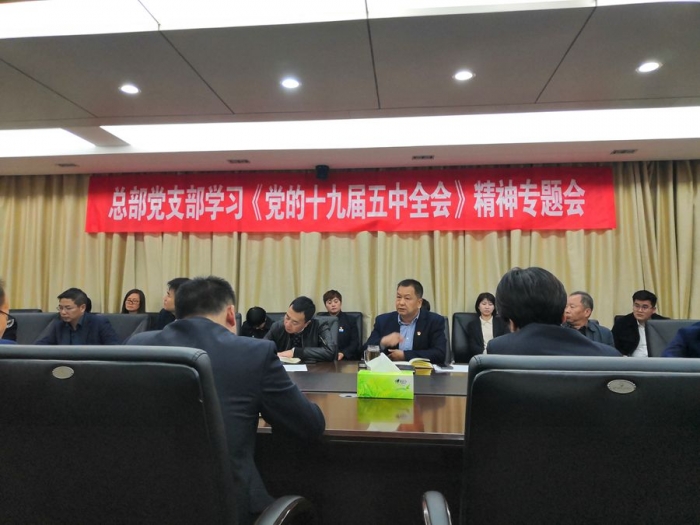 2020年11月10日晚,公司總部黨支部組織召開學(xué)習(xí)貫徹《黨的十九屆五中全會(huì)》精神專題會(huì)。公司董事長(zhǎng)、黨委書記胥立、班子成員及各部門相關(guān)黨員干部共計(jì)30余人參會(huì),會(huì)議由總部黨支部書記沈?yàn)槊裰鞒帧?/span>