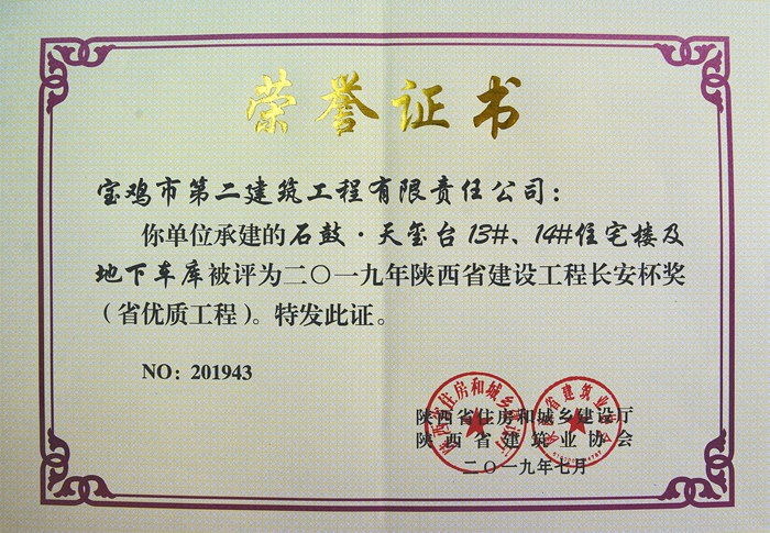 2019年陜西省建設(shè)工程長安杯獎(jiǎng)(石鼓?天璽臺13#、14#住宅樓及地下車庫)