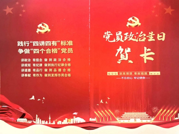 集團(tuán)公司總部黨支部為黨員集體過政治生日,向每名黨員贈送了政治生日賀卡,號召大家牢記初心使命,履職盡責(zé)擔(dān)當(dāng),充分發(fā)揮好黨員的先鋒模范和帶頭示范作用,砥礪前行,繼續(xù)奮斗,以實際行動迎接黨的二十大勝利召開!