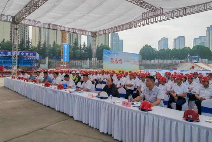 集團(tuán)公司黨委副書記、總經(jīng)理?xiàng)罱?,副總?jīng)理、總會(huì)計(jì)師嚴(yán)海軍,副總經(jīng)理申小龍出席儀式。集團(tuán)公司總部相關(guān)部門,寶雞片區(qū)各項(xiàng)目部負(fù)責(zé)人、專職安全管理人員及現(xiàn)場(chǎng)施工人員共計(jì)150余人參加了本次活動(dòng),儀式由副總工程師、工程管理部經(jīng)理郭為群主持。
